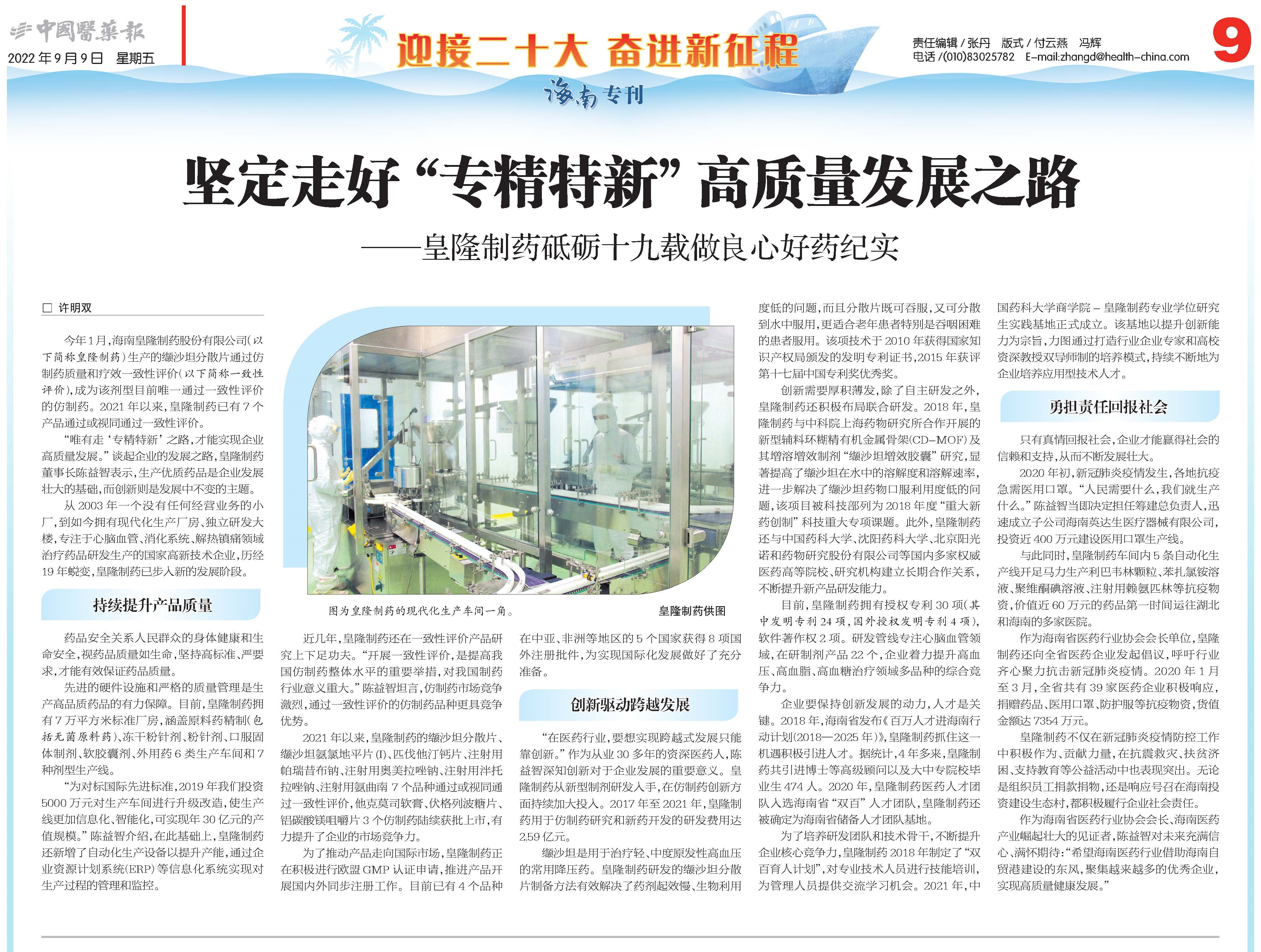 《中國醫(yī)藥報》9月9日海南??簣远ㄗ吆谩皩>匦隆备哔|(zhì)量發(fā)展之路—皇隆制藥砥礪十九載做良心好藥紀(jì)實
