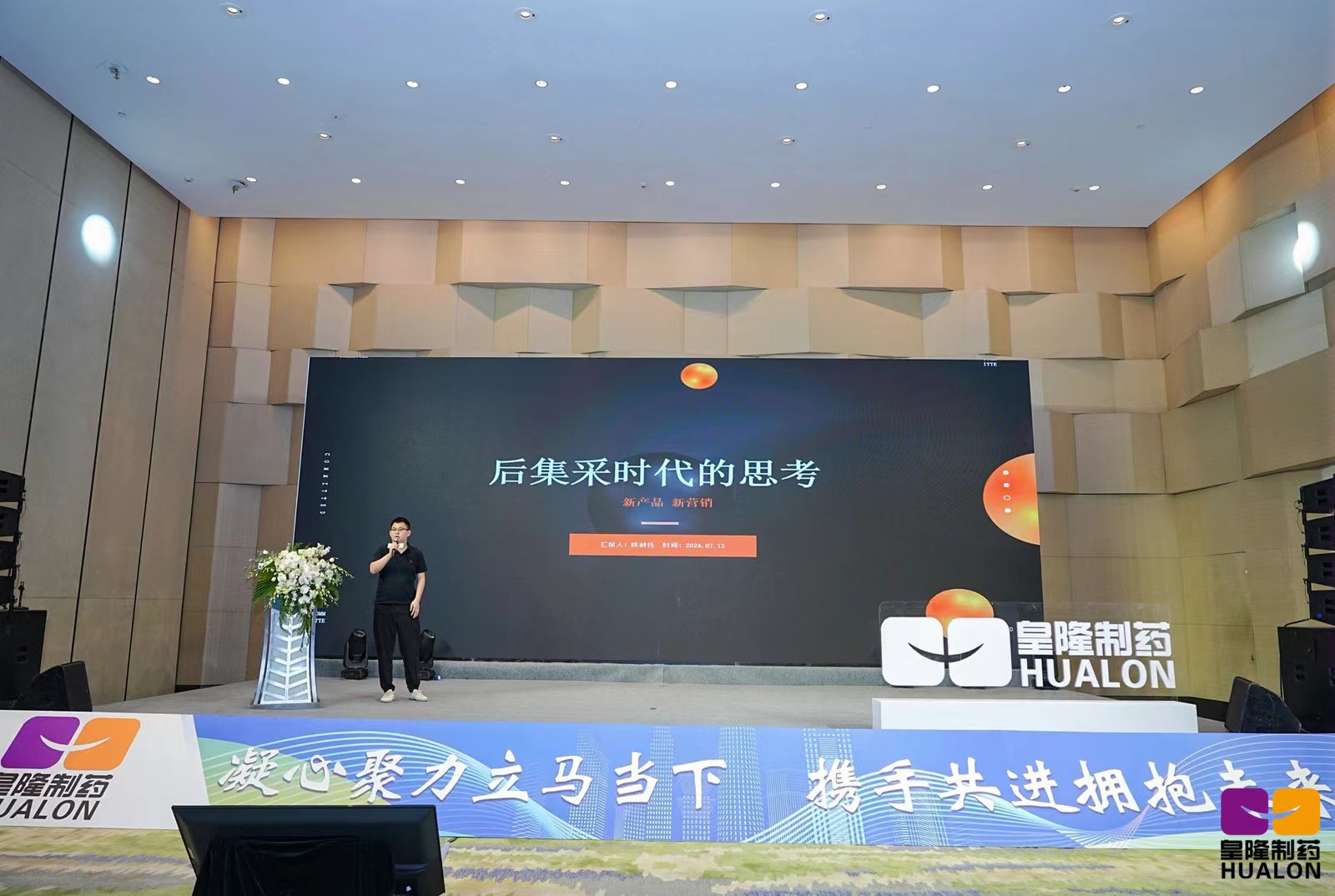 7月13日上午,公司組織全體客戶和省區(qū)經理召開產品推介及銷售政策解讀會議,皇隆制藥董事長陳益智、副總經理陳峙托、產品經理魏小杰分別做主題報告,他們分別就公司產品的優(yōu)勢特點、集采產品的運營及實操、產品政策及市場前景深入剖析,為客戶展現(xiàn)了清晰的合作發(fā)展藍圖。會議由皇隆制藥總經理助理方海霞主持。
